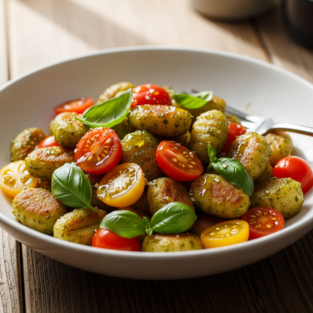 Did you know you can air fry shelf-stable or refrigerated gnocchi without boiling them first? They develop a crispy exterior and a pillowy interior. Toss the roasted gnocchi with fresh basil pesto and cherry tomatoes for a fast, Italian-inspired dinner that children and adults alike will enjoy.