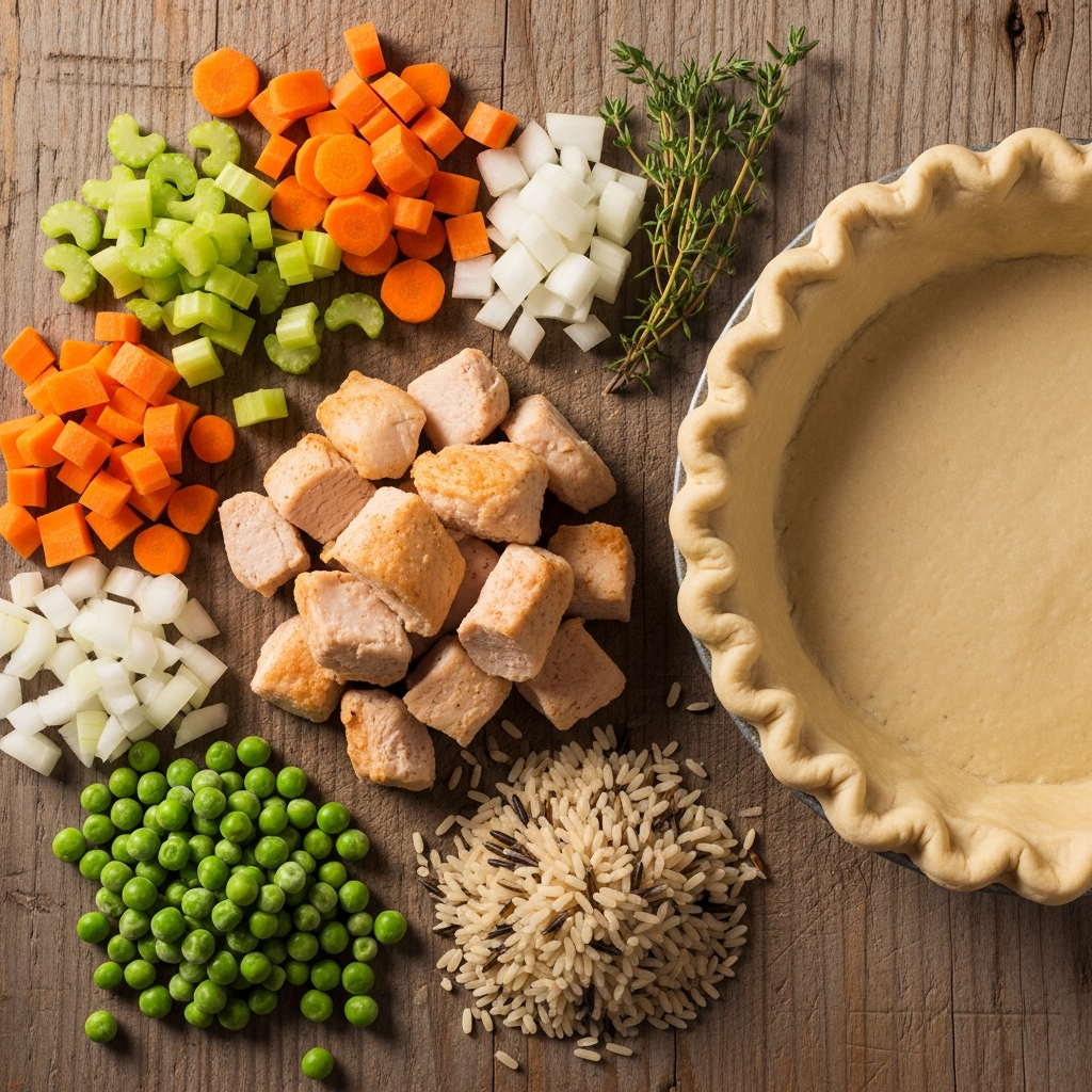 - Step 6: Combine Filling. Stir in the cooked chicken, cooked wild rice, dried thyme, dried sage, salt, and black pepper into the thickened sauce. Add the frozen peas and corn. Stir everything gently to combine well. Taste and adjust seasonings if needed.