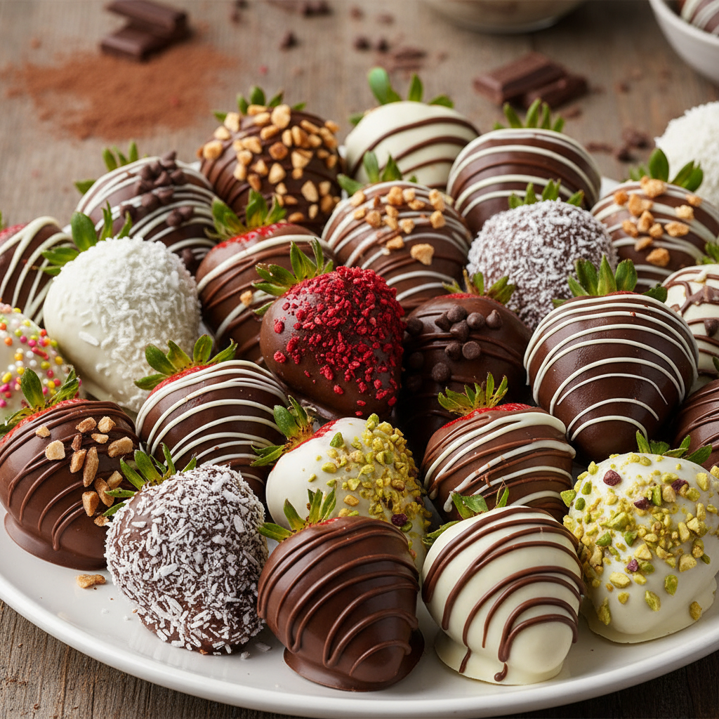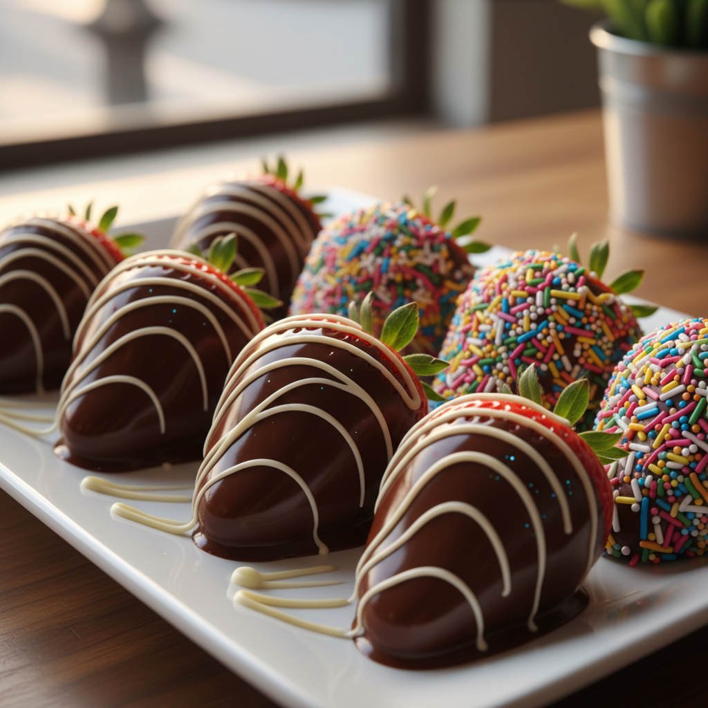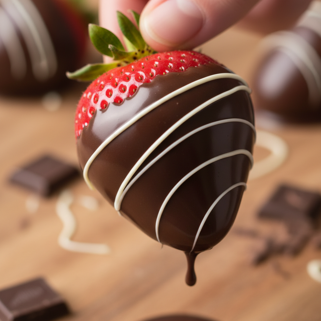 - Chocolate Drizzle Melt a contrasting chocolate (e.g., white chocolate over dark chocolate dipped berries) and use a spoon or a piping bag with a small hole to drizzle patterns over the set strawberries.
