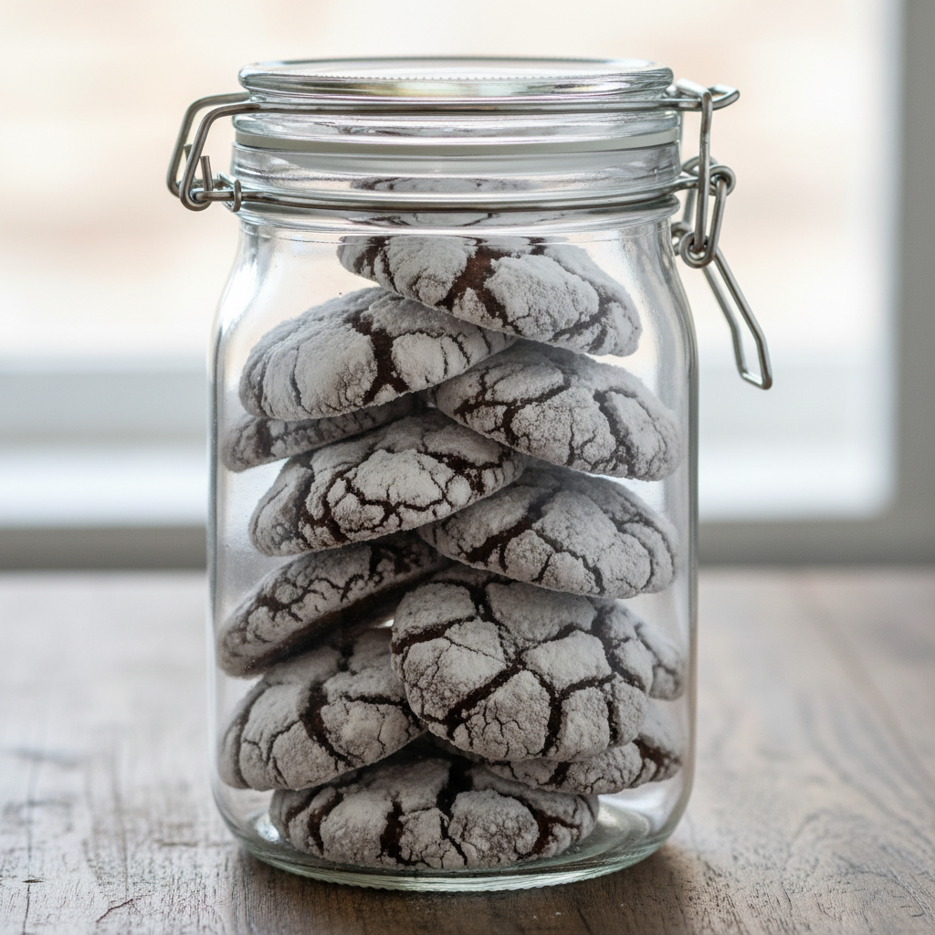 Store your freshly baked chocolate crinkle cookies in an airtight container at room temperature for up to 5-7 days. To maintain their freshness and fudgy texture, you can also place a slice of bread in the container; the cookies will absorb moisture from the bread, keeping them soft.