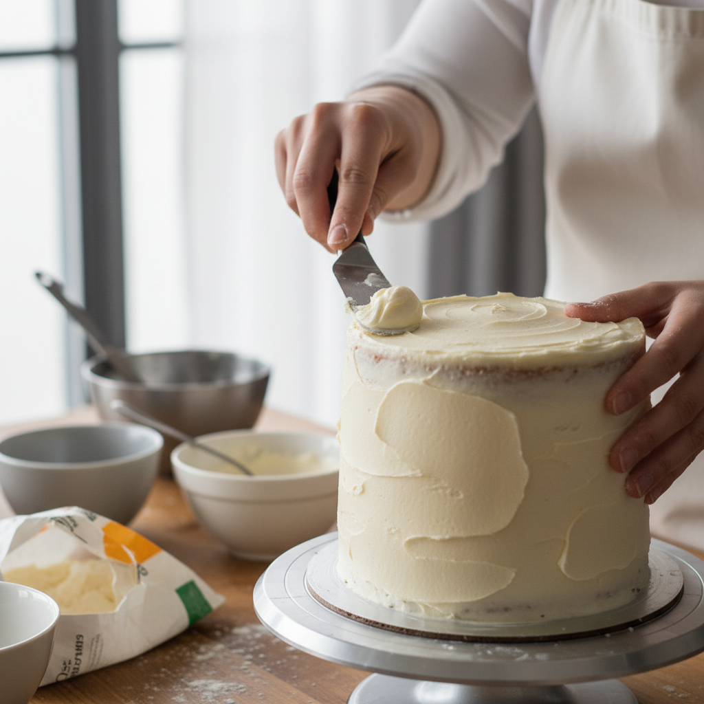 - Make the Frosting While the cakes cool, prepare the buttercream. In a large bowl, beat the softened butter with an electric mixer until creamy. Gradually add the sifted powdered sugar, beating until smooth. Add 3 tablespoons of heavy cream or milk, vanilla extract, and a pinch of salt. Beat on high speed until light and fluffy. Add more cream if needed to reach desired consistency.