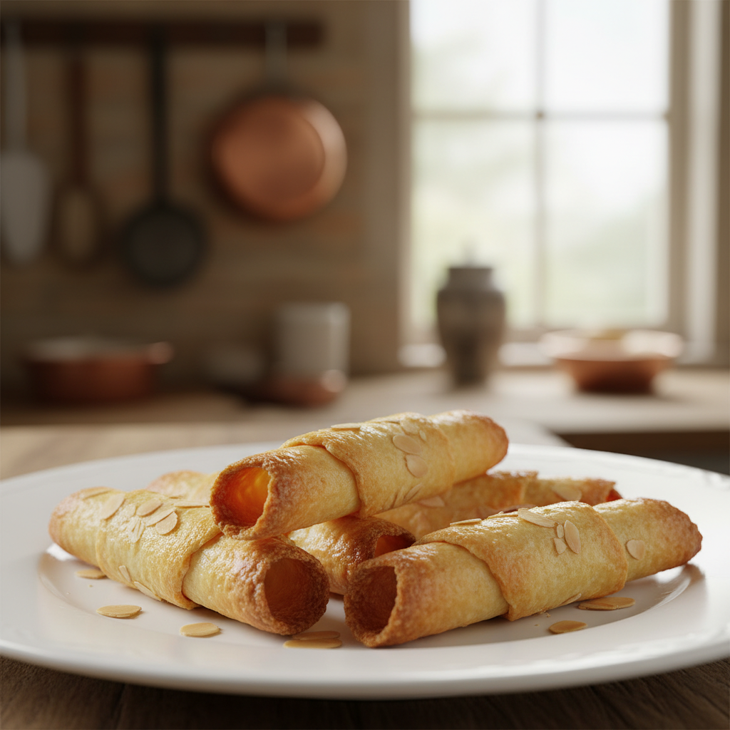 Tuiles, meaning ’tiles’ in French, are named after the curved roof tiles found in the French countryside. This classic French cookie is believed to have originated in the Burgundy region of France. Traditionally, they were shaped while still warm and pliable, often draped over a rolling pin or a bottle to achieve their signature curve. These elegant cookies became a staple in French bakeries and homes, cherished for their delicate texture and versatility. They’re a testament to French culinary philosophy – taking simple ingredients and transforming them into something truly special through careful technique.