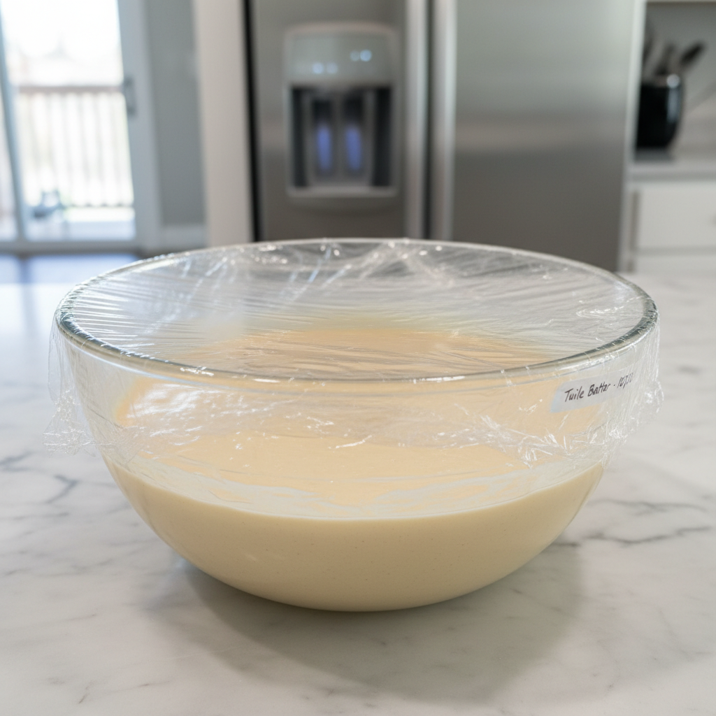 - Batter The tuile batter can be made up to 2 days in advance and stored in the refrigerator. Give it a good whisk before using, as the butter may solidify slightly.