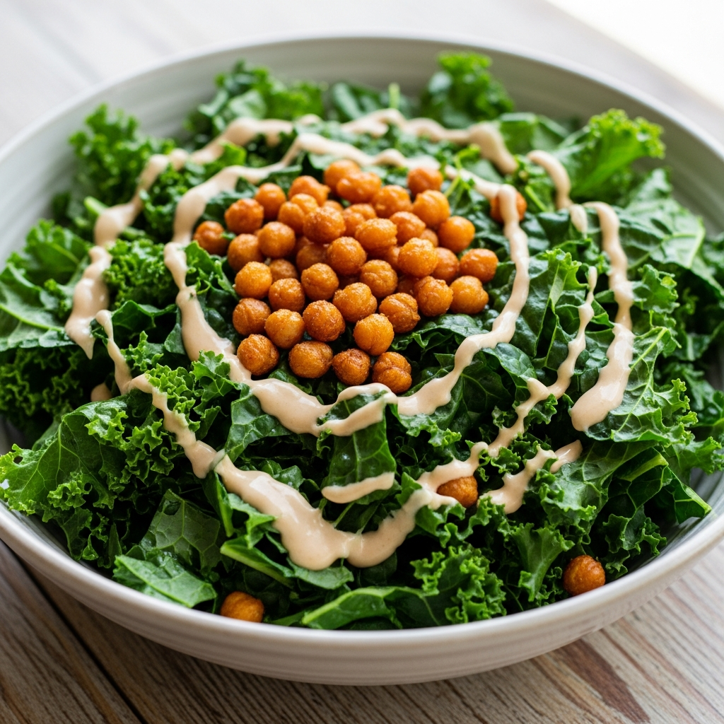 Massaging kale with a little olive oil softens the leaves and makes them easier to digest. Topping the kale with crunchy roasted chickpeas provides a satisfying texture and plant-based protein. This salad is hearty enough to be a main course and holds up well if prepared ahead of time.