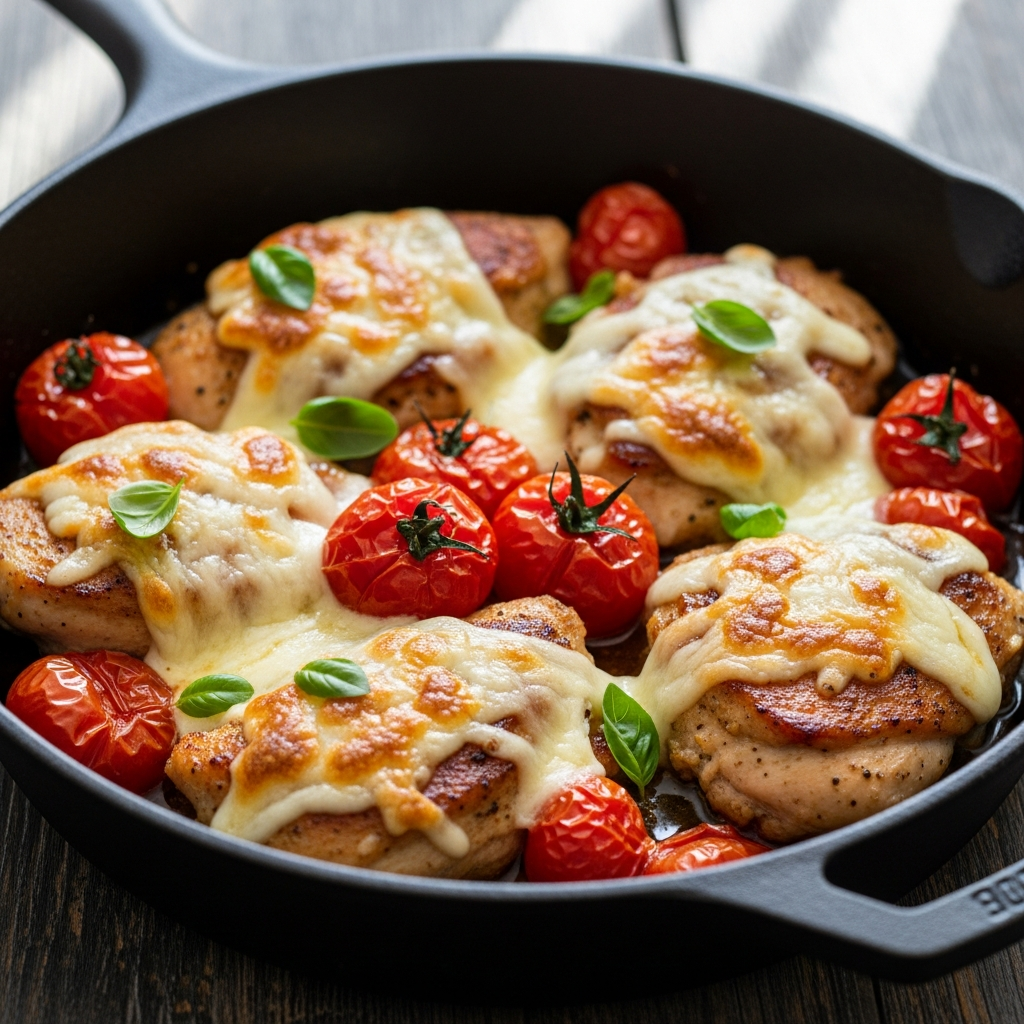 This one-pan meal features chicken breasts cooked with cherry tomatoes, fresh mozzarella pearls, and basil. The tomatoes burst during cooking to create a natural sauce. It is a high-protein dish that captures the essential flavors of summer in a single, easy-to-clean skillet.