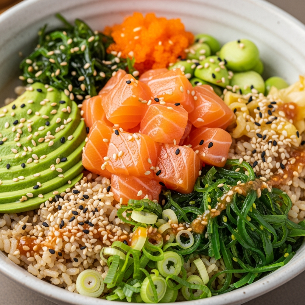 A deconstructed sushi bowl using fresh, high-quality salmon and creamy avocado provides healthy fats and high-quality protein. Using a base of brown rice or cauliflower rice keeps it within clean eating standards. Adding radish, seaweed, and cucumber provides crunch and essential minerals.
