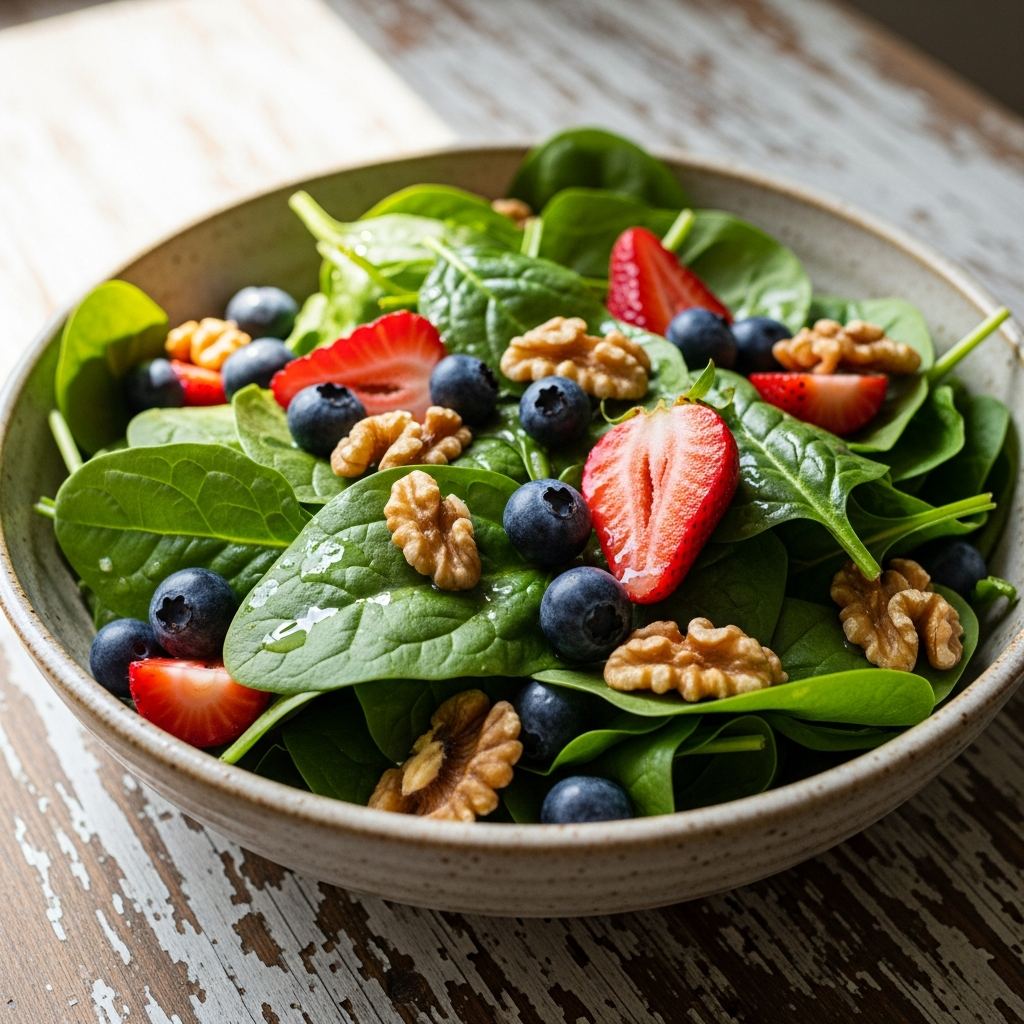 Summer is the peak season for berries. A bed of fresh baby spinach topped with strawberries, blueberries, and toasted walnuts provides a wide range of phytonutrients. A light vinaigrette made with apple cider vinegar and honey enhances the natural sweetness of the fruit while keeping the dish clean and wholesome.