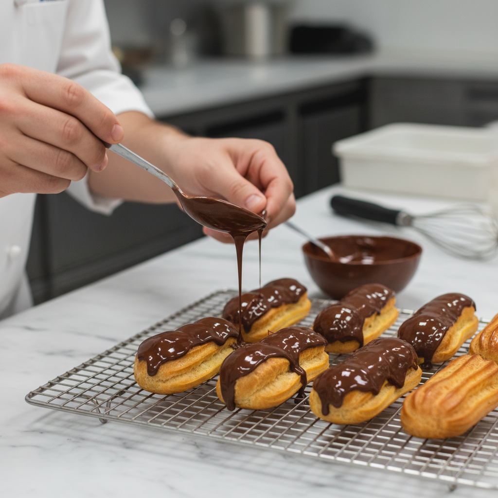 - Room Temperature Glaze: For the best shine and spread, ensure your chocolate glaze is warm but not hot when dipping the eclairs.