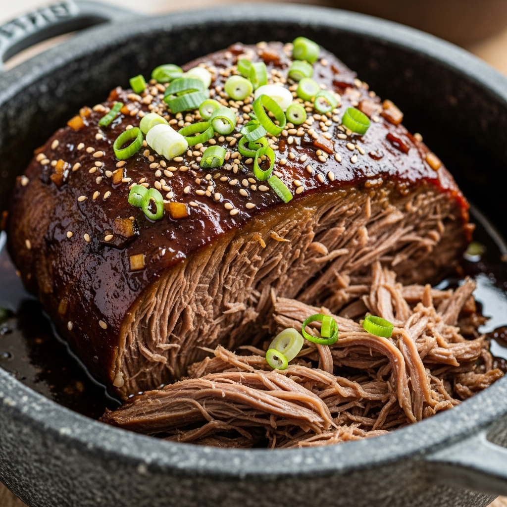 Adding a cup of strong brewed coffee to a Korean braise might sound unusual, but it works brilliantly to deepen the color and add a slight bitterness that balances the sugar and spice of Gochugaru (Korean red chili flakes). The coffee acts similarly to red wine, providing an acidic component that helps tenderize the beef over several hours. The result is a roast with a deep, dark exterior and a complex, smoky flavor profile that is truly unique.