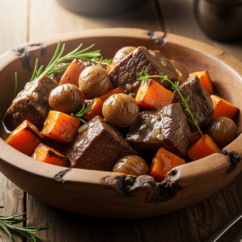 Following the tradition of royal Korean court cuisine, adding sweet potatoes and chestnuts to your pot roast introduces varied textures and natural sweetness. The chestnuts become creamy when slow-cooked, and the sweet potatoes soak up the salty braising liquid. This version of the roast is a complete meal in itself, providing a balanced mix of protein, starch, and healthy fats. It is the ultimate comfort food for cold autumn or winter evenings.