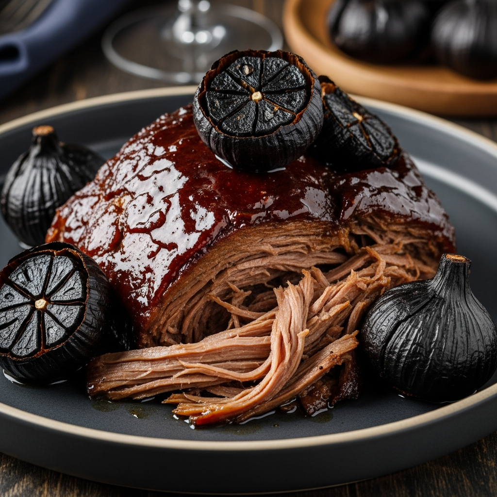 Black garlic, which is aged and fermented, offers a balsamic-like sweetness and a soft texture. Incorporating mashed black garlic into the braising liquid creates a dark, visually striking roast with a complex, sweet-savory taste. This modern take on the Korean roast is perfect for dinner parties where you want to impress guests with a unique flavor that lingers on the palate. The garlic melts into the sauce, enriching the overall consistency.
