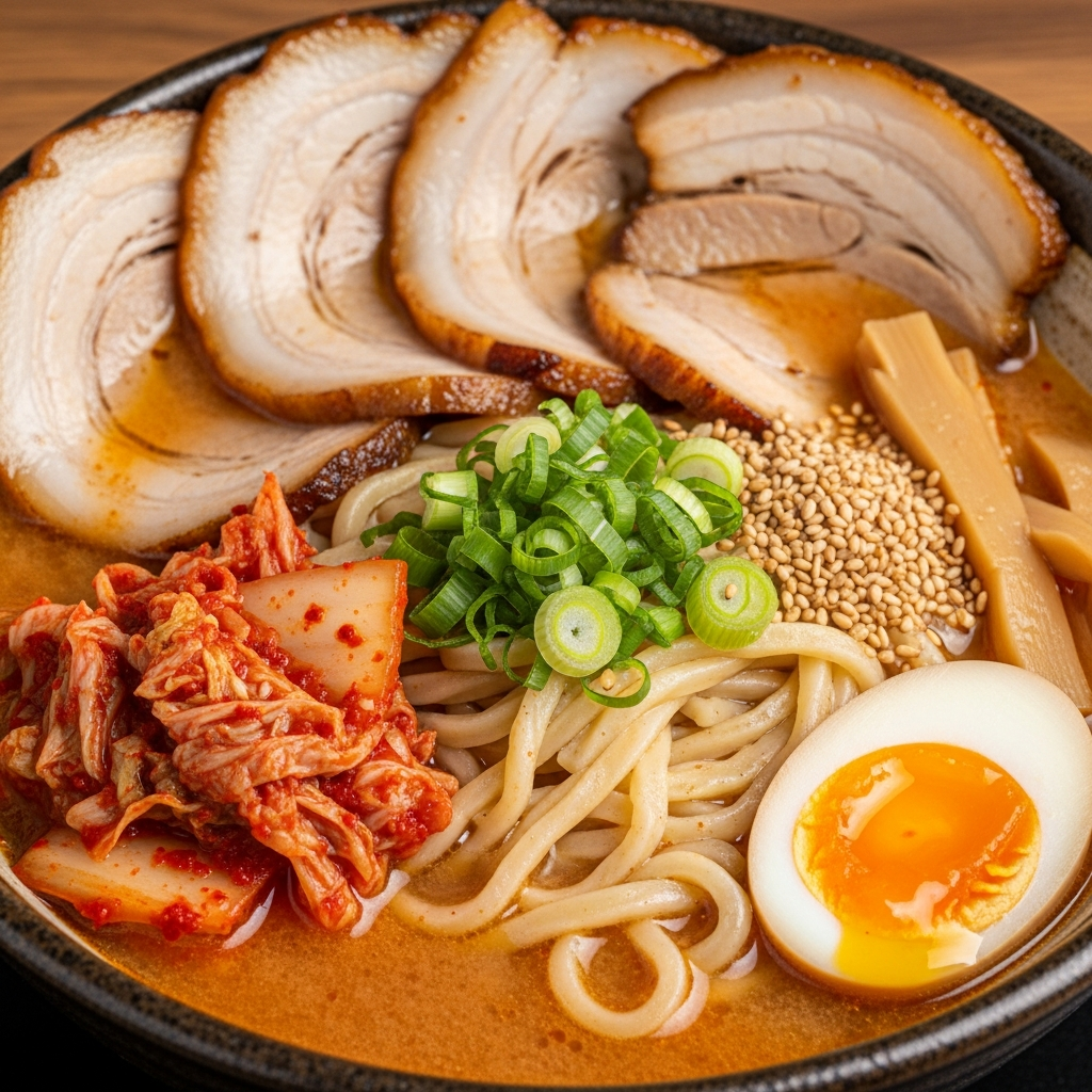 This fusion bowl combines the fermented heat of Korean kimchi with the savory depth of Japanese miso. Slow braised pork belly provides a melt in your mouth texture that complements the acidity of the kimchi. The resulting broth is vibrant and multi layered, offering a spicy and savory experience that is significantly fresher than anything delivered in a plastic container.