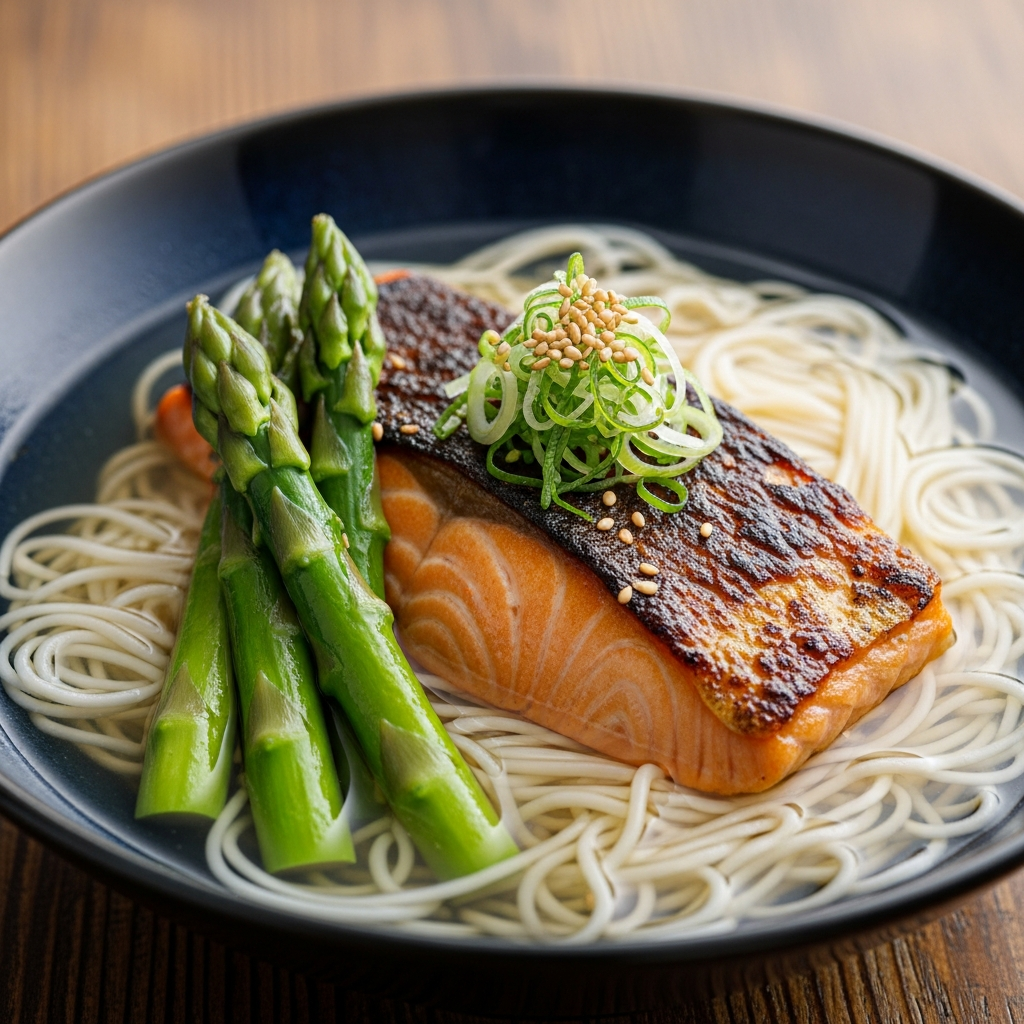 Turn your noodle bowl into a gourmet centerpiece by adding a fillet of miso glazed salmon. Broil the salmon until the exterior is caramelized and flaky, then place it atop a bed of somen noodles in a light miso dashi. The addition of blanched asparagus adds a fresh crunch that balances the richness of the fish, making it a perfect dish for hosting guests.