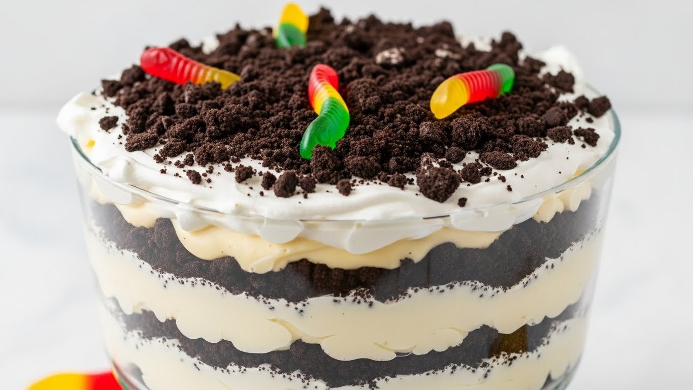 Think about it: layers of creamy chocolate pudding, fluffy whipped topping, and crushed chocolate sandwich cookies that look just like “dirt.” On top, colorful gummy worms are peeking out of the crumbs. It is silly, cute, and completely delicious.