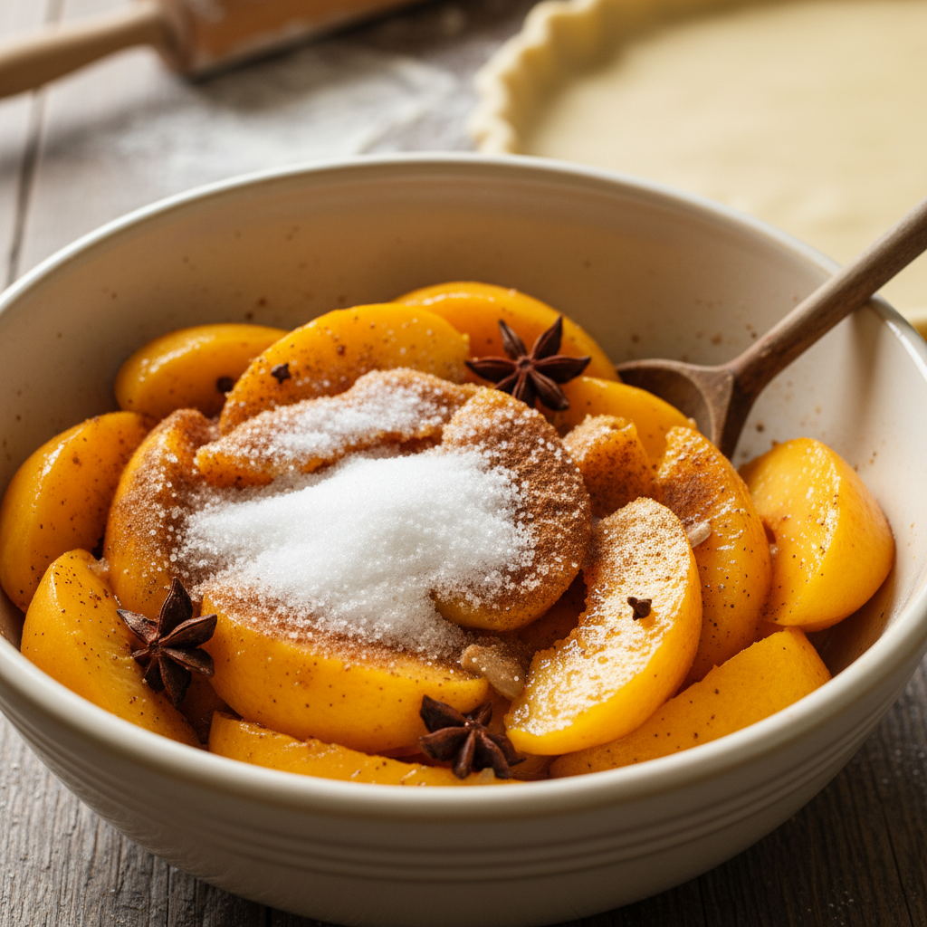 - Combine Pour the sugar mixture over the peaches and gently toss to coat evenly. Set aside.