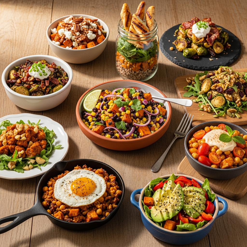 Roast sweet potatoes with chili powder, cumin, and a dash of cayenne. After roasting, stir in black beans (rinsed and drained), thawed corn kernels, finely diced red bell pepper, and plenty of fresh cilantro. Dress with a zesty lime-cilantro dressing (lime juice, olive oil, a little honey, chopped cilantro). Add some avocado chunks before serving!