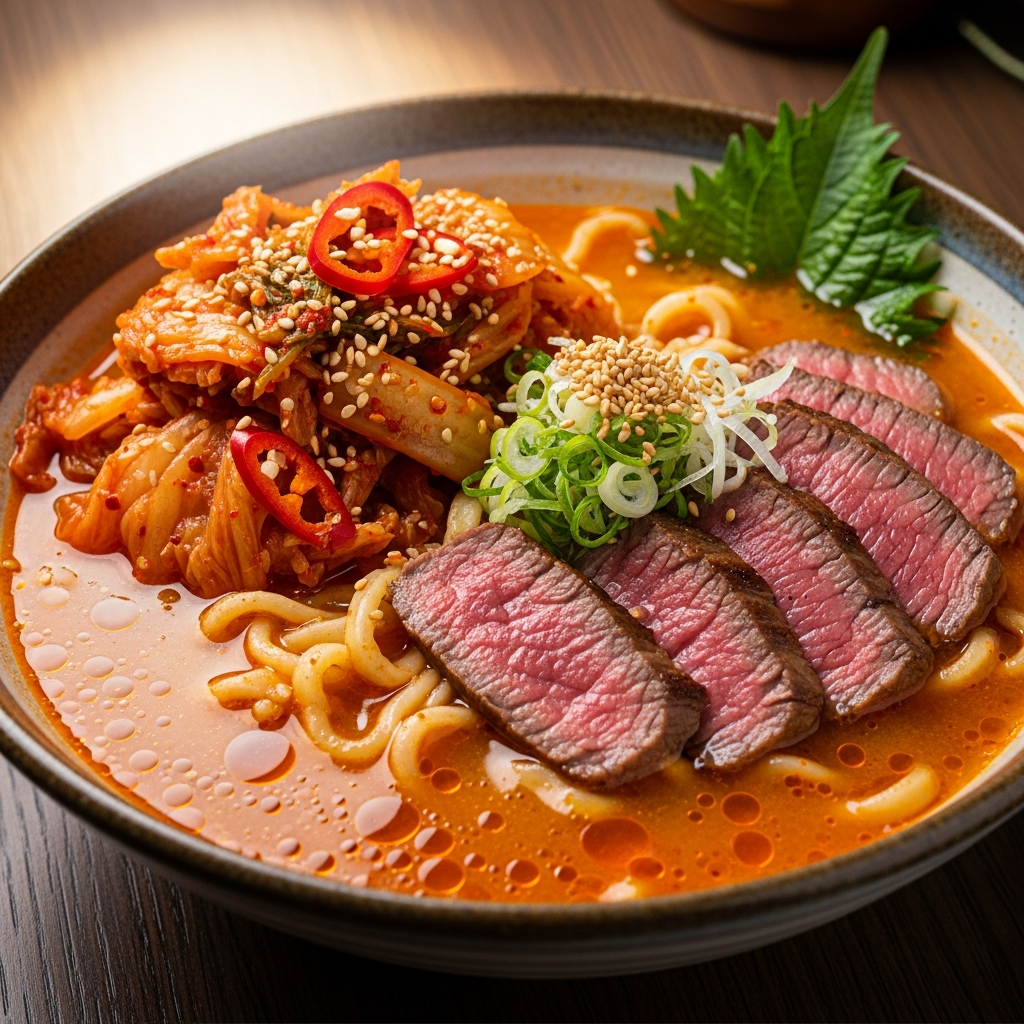 By incorporating Korean fermented elements, this bowl achieves a tangy and spicy profile. Gochujang provides a thick, sweet-heat base that pairs exceptionally well with white miso. The addition of aged kimchi introduces acidity which cuts through the richness of the beef fat. It is a complex bowl that highlights the synergy between Japanese miso and Korean spice traditions, often finished with a sprinkle of toasted sesame seeds for nuttiness.