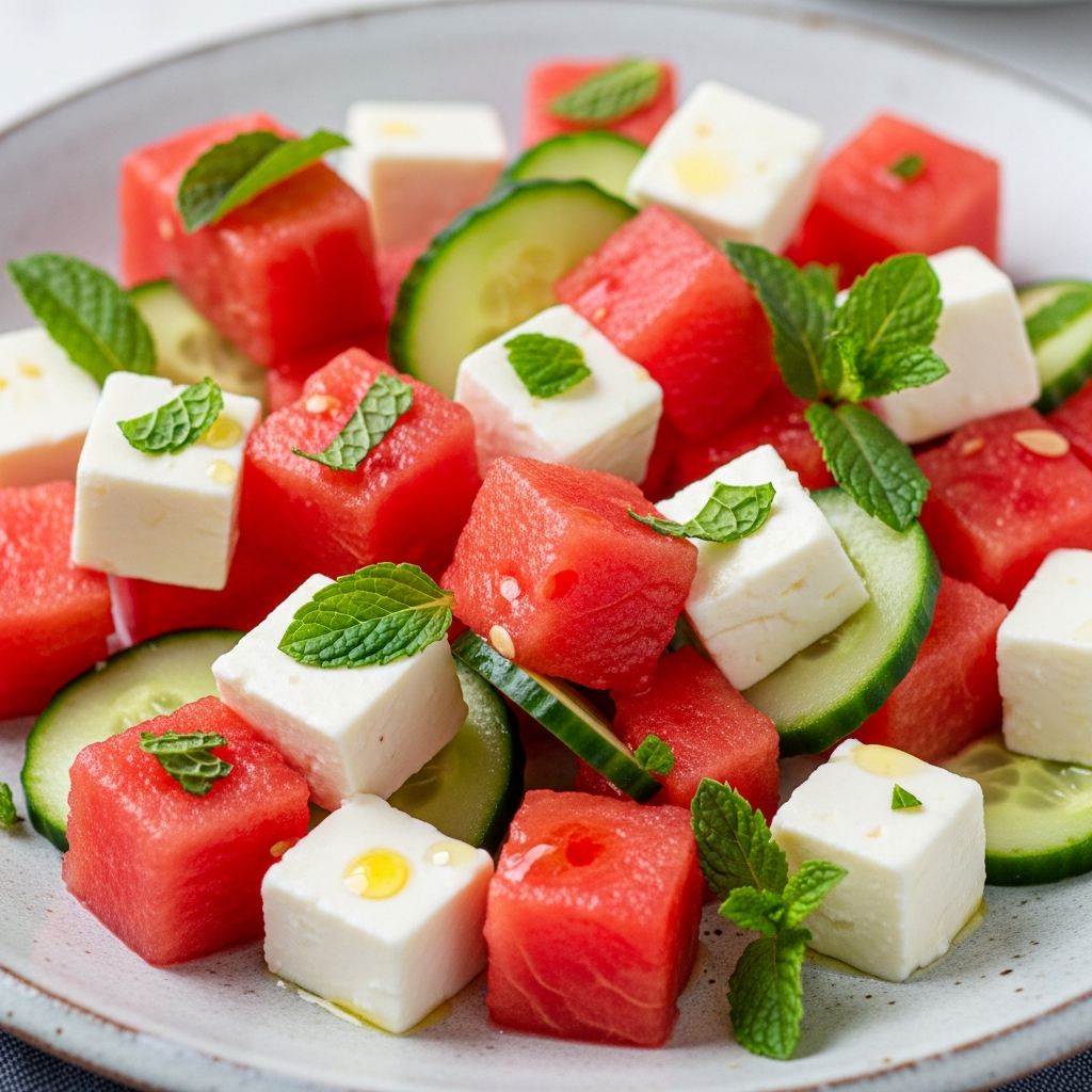 This refreshing salad is a quintessential summer dish. The contrast between the cold, sweet watermelon and the salty, crumbly feta is unmatched. Add cucumber for extra crunch and finish with a simple olive oil and lime vinaigrette.