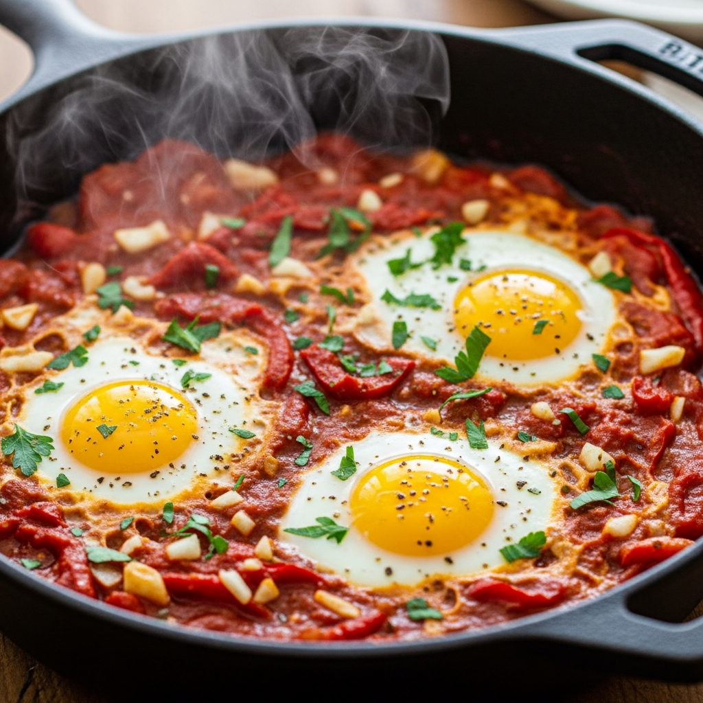 Shakshuka is an excellent communal dish for weekend brunches. During summer, incorporate colorful bell peppers and vine-ripened tomatoes into the sauce. Poach eggs directly in the spicy tomato base and serve with warm crusty bread for dipping.
