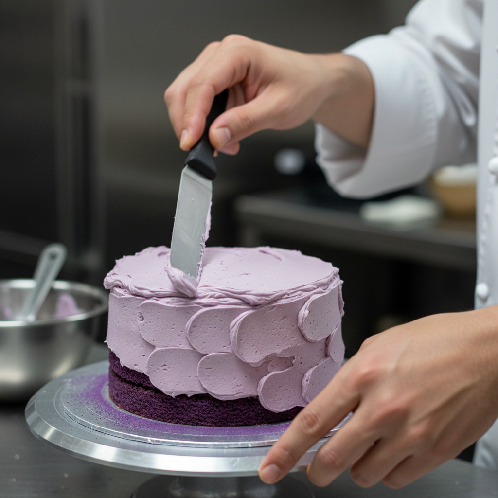 - Make the Frosting While the cakes cool, prepare the frosting. In a large bowl with an electric mixer, beat the softened butter until creamy. Gradually add the sifted powdered sugar, alternating with milk/cream, until smooth and fluffy. Beat in the ube extract and a pinch of salt. Adjust consistency with more powdered sugar or milk as needed.