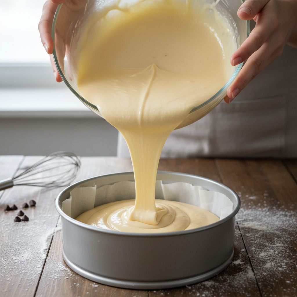 - Pour and Bake: Pour the batter evenly into the prepared cake pan. Bake for 30-35 minutes, or until a wooden skewer inserted into the center comes out clean.